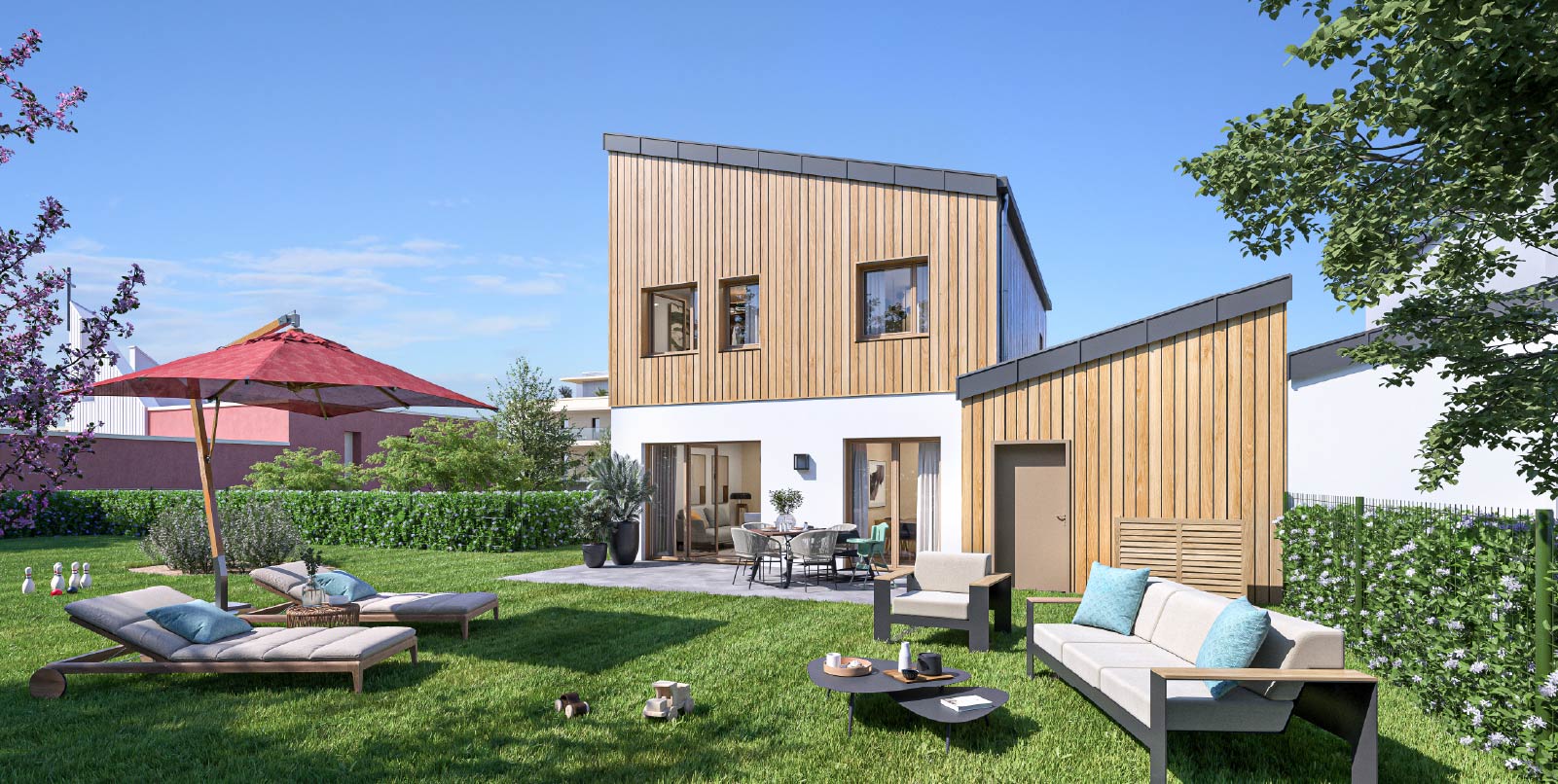 Deux hameaux intimistes proposent des ensembles de maisons aux structures et aux façades en bois clair, en accord parfait avec la nature. Toutes les maisons proposent des intérieurs modulables qui s’aménageront en chambre ou en espace dinatoire supplémentaire, selon les modes de vie de chacun. Les jardins, dont la surface peut aller jusqu’à 400 m2, sont équipés de terrasses et propices à une vie conviviale. Afin de préserver l’intimité des résidants, ils disposent de haies arborées. Le garage et l’espace de stationnement sous la pergola permettent d’accueillir jusqu’à deux véhicules.
