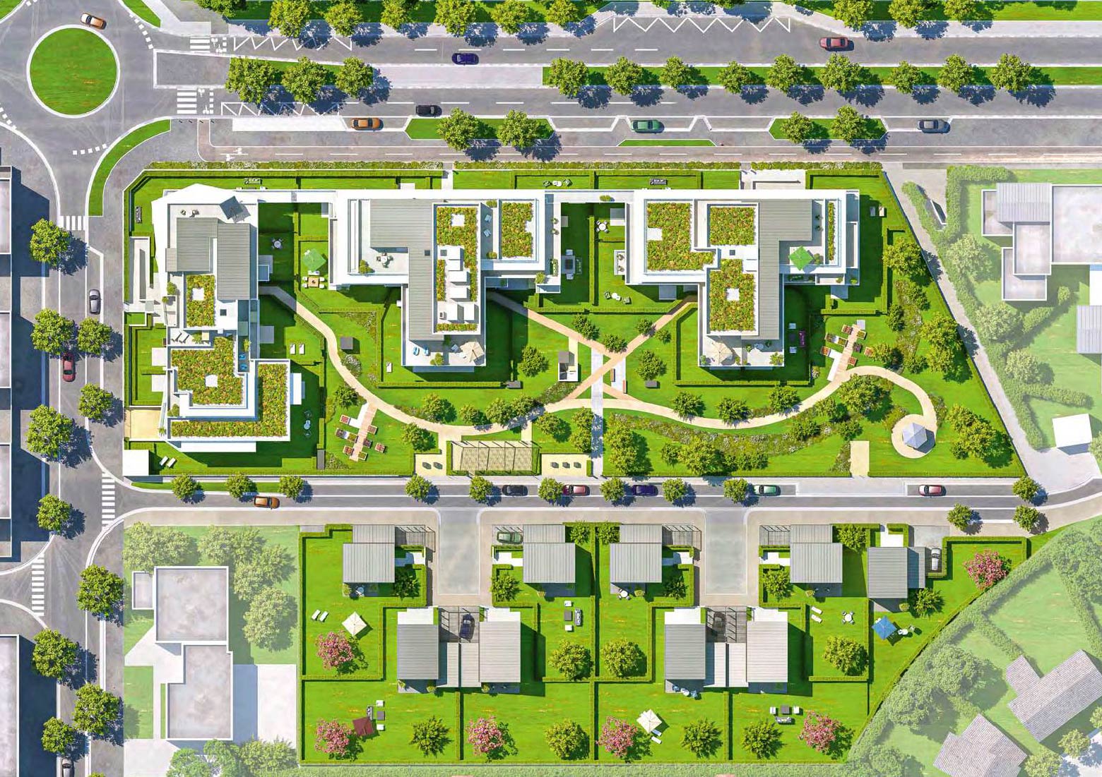 Traversé par la rue George Sand, l’ensemble résidentiel incarne la coexistence harmonieuse d’appartements de standing et de maisons.